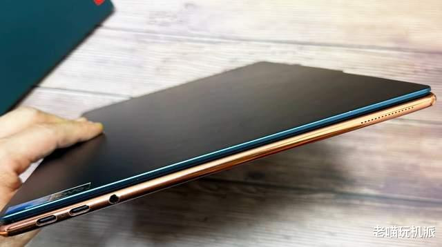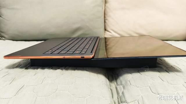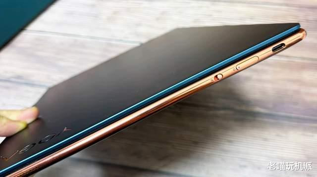 黑色玫瑰金组合高级感。拆包装取真机,小编拿到手的这台yogaAir14s是二手产品,成色一般,但质感依旧出色,主要是机器的黑色加玫瑰金组合,金属质感和颜色过渡,非常显著。点睛之笔的当然是玫瑰金的腰线,压住了黑色的边框,让机器13.9mm的厚度显得更加纤薄。中框上,甚至看得到刚好勉强塞入一个typec口的厚度,且从传统直角边样式改成了圆形弧度的样式,视觉上也减轻了厚度的积压。正常握持机器,单手开合,游刃有余。